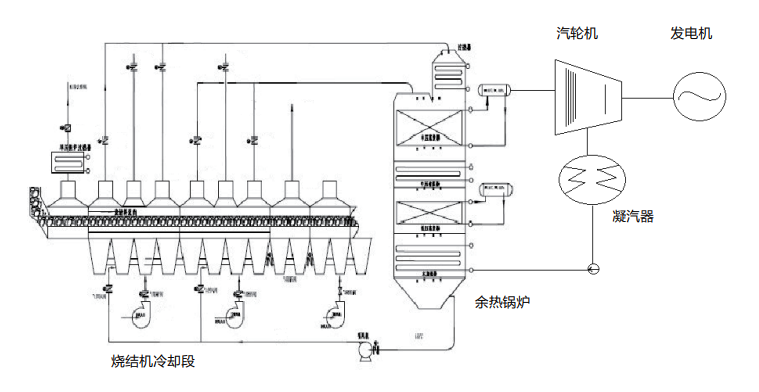 利用余熱鍋爐對(duì)燒結(jié)礦環(huán)冷機(jī)或帶冷機(jī)所產(chǎn)高溫廢氣的余熱實(shí)施回收,用以蒸汽發(fā)電,并對(duì)冷卻后的廢氣重新回收,進(jìn)行循環(huán)利用。