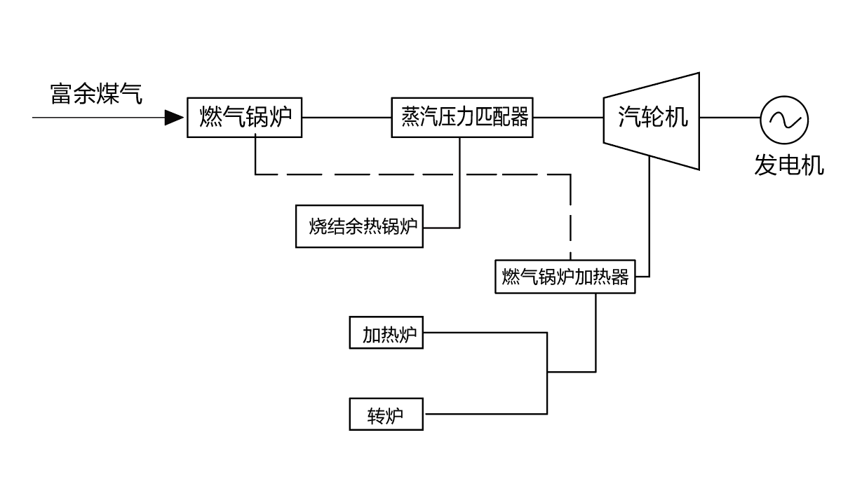 該技術(shù)綜合利用多種蒸氣源進行汽輪機發(fā)電,利用富余煤氣建設(shè)燃?xì)忮仩t。鍋爐所產(chǎn)蒸汽連同燒結(jié)環(huán)冷余熱鍋爐所產(chǎn)蒸汽,共同作為汽輪發(fā)電機的主汽源。轉(zhuǎn)爐汽化冷卻裝置與加熱爐汽化冷卻裝置產(chǎn)出的低壓蒸汽,經(jīng)過燃?xì)忮仩t煙道中過熱器的過熱后,成為汽輪機發(fā)電的補汽源,廠區(qū)余熱余能得以綜合、高效利用。